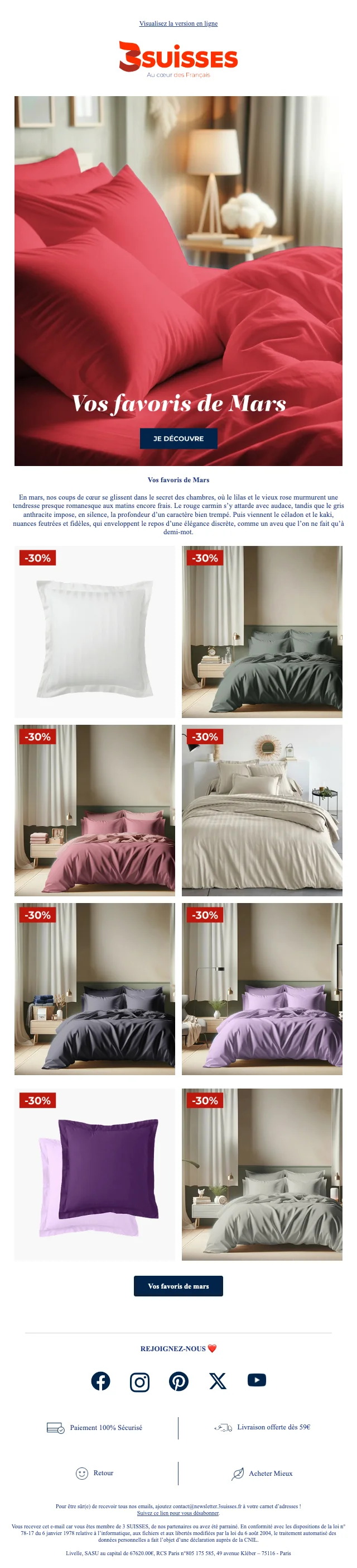 Les 3 Suisses vous proposent de bonnes affaires et des promotions en permanence, tout au long de l'année alors restez à l'affût. De plus, sachez que la livraison et le retour de vos articles sont gratuits dès 49 € d'achats. Sur ce site, vous pouvez profiter de codes promo et de bons de réductions pour obtenir des remises supplémentaires.