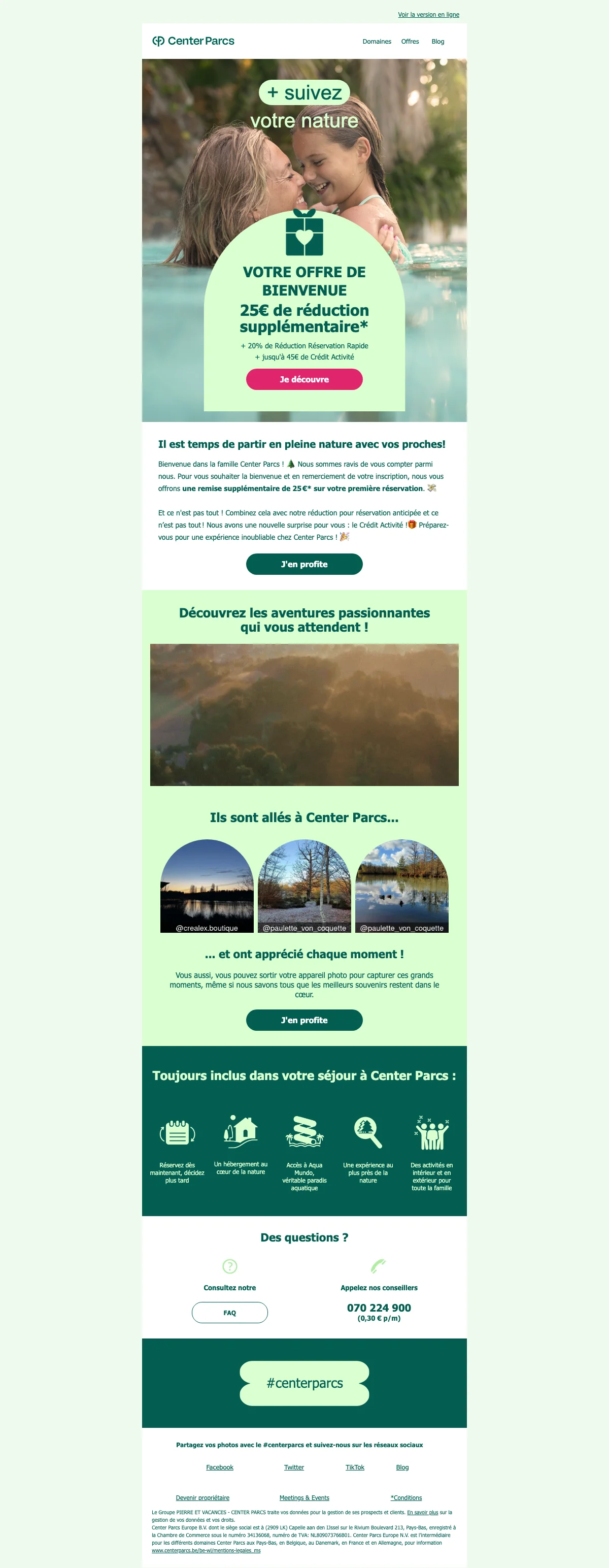 Votre code promo Center Parcs de 25€ à l'inscription newsletter