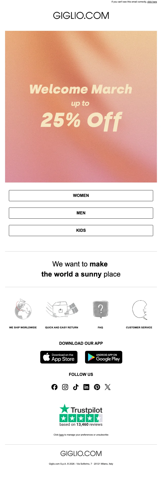 Les codes promo pour Giglio sont rares : au cours des 6 derniers mois, un seul code était disponible. Nous surveillons cette boutique de près et vous informerons dès que de nouveaux codes seront disponibles. Avez-vous trouvé un vous-même ? Faites-le-nous savoir !