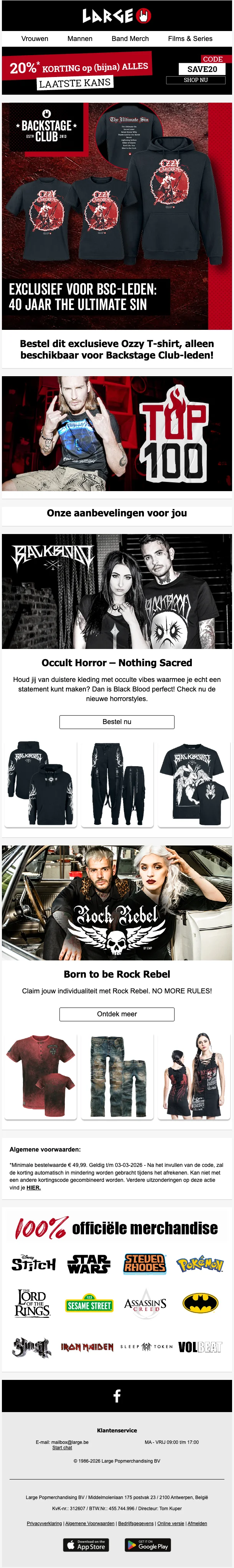 La fidélité est également récompensée chez LARGE, et vous êtes invité à rejoindre la communauté : le Backstage Club. Adhérer au Backstage Club, c'est profiter d'avantages exclusifs : frais de port gratuits sur toutes vos commandes (sans montant minimum), cadeaux, participation à des concours exclusifs, réductions sur le site et chez les marques partenaires, un délai de 100 jours pour retourner tout article qui ne conviendrait pas, et même un accès à des zones backstage lors de festivals et évènements tels que le Hellfest ou Summerbreeze !