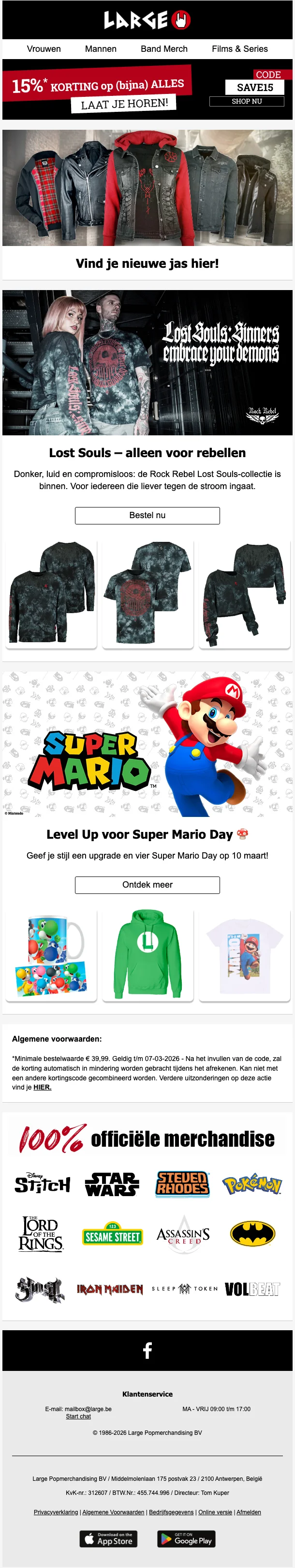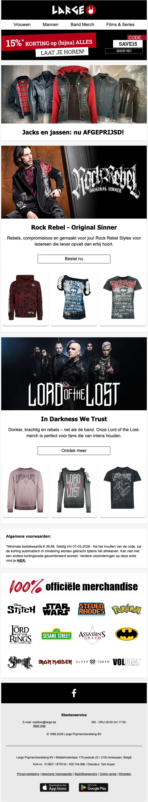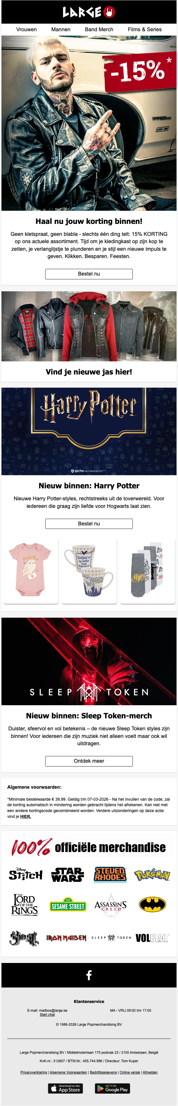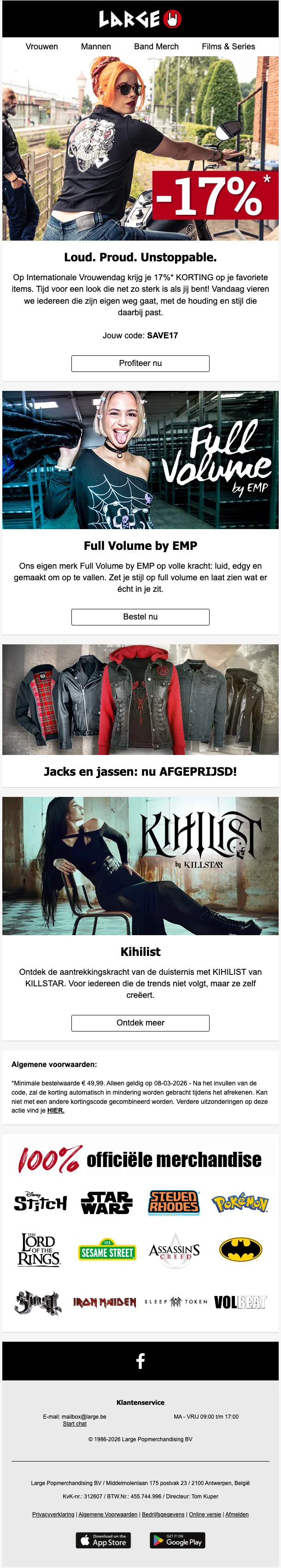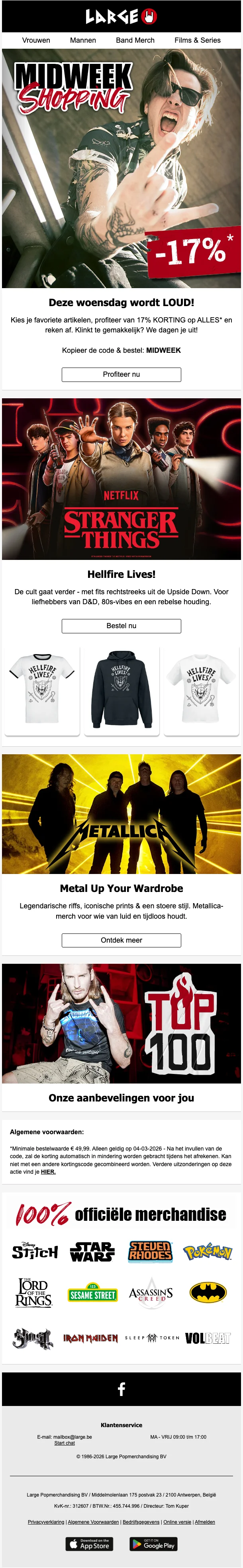 Créé en 1986, LARGE (anciennement EMP) est un site de vente par correspondance de produits dérivés et d'articles de mode alternative, autour de divers thèmes : musique, films, séries, jeux vidéo, super-héros… L'ambition de LARGE est de proposer des produits permettant à ses clients de cultiver leur différence, de sortir du lot, et d'exprimer à travers leurs vêtements et accessoires leur personnalité, leurs passions et leurs centres d'intérêt. Sur la boutique en ligne, vous retrouvez tous les produits de merchandising de vos groupes, sagas, jeux et personnages préférés, avec plus de 20.000 articles proposés !