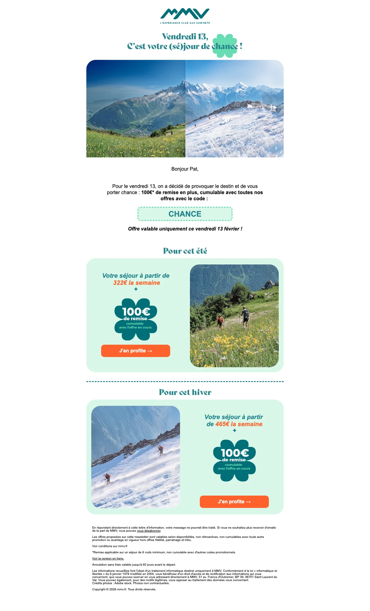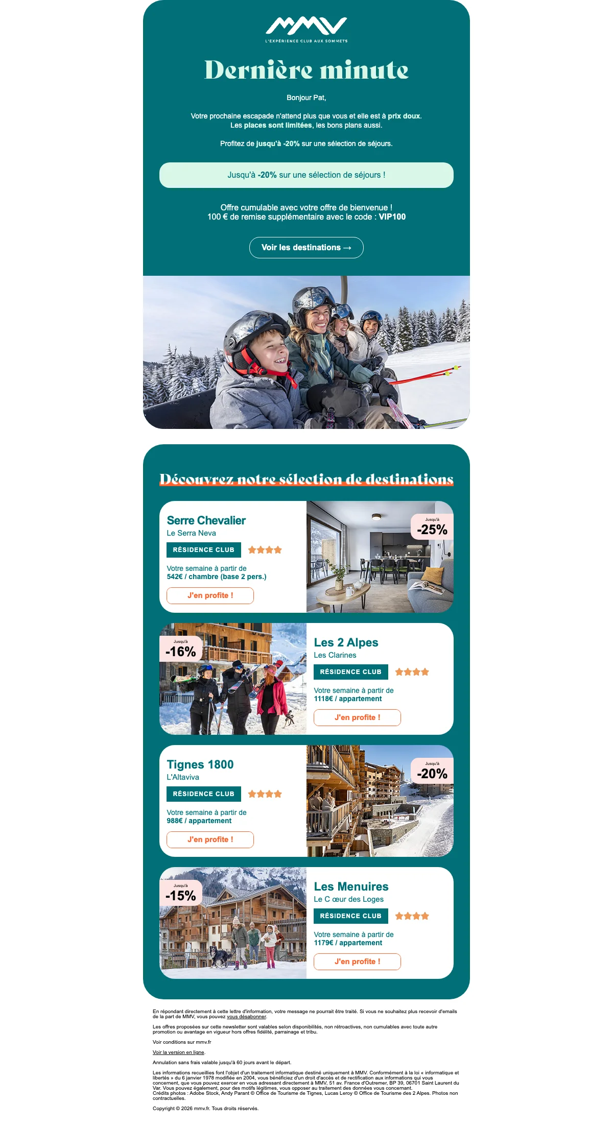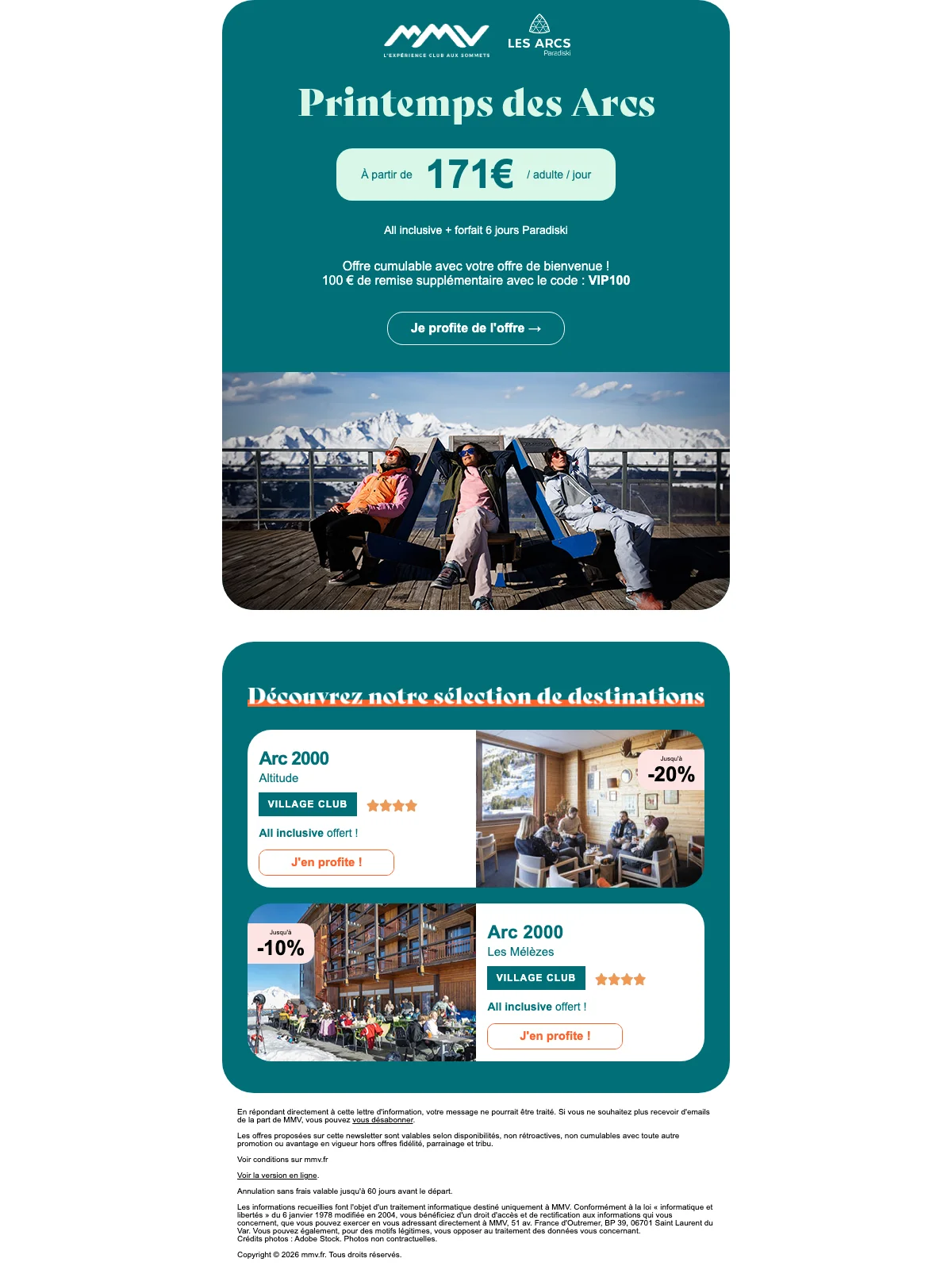 Le/la MMV code promo est PRINTEMPS. Saisissez notre code pour MMV 2026 dans le formulaire de paiement et bénéficiez de réductions exclusives. MMV printemps printemps au ski : jusqu'à 30% sur les séjours.