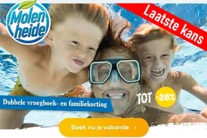 Vous pouvez profiter de diverses réductions à Molenheide. Réservez-vous à l'heure? Ensuite, vous recevrez une réduction pour les lève-tôt. Les jeunes familles et les personnes de plus de 50 ans bénéficient également toujours d'une réduction.